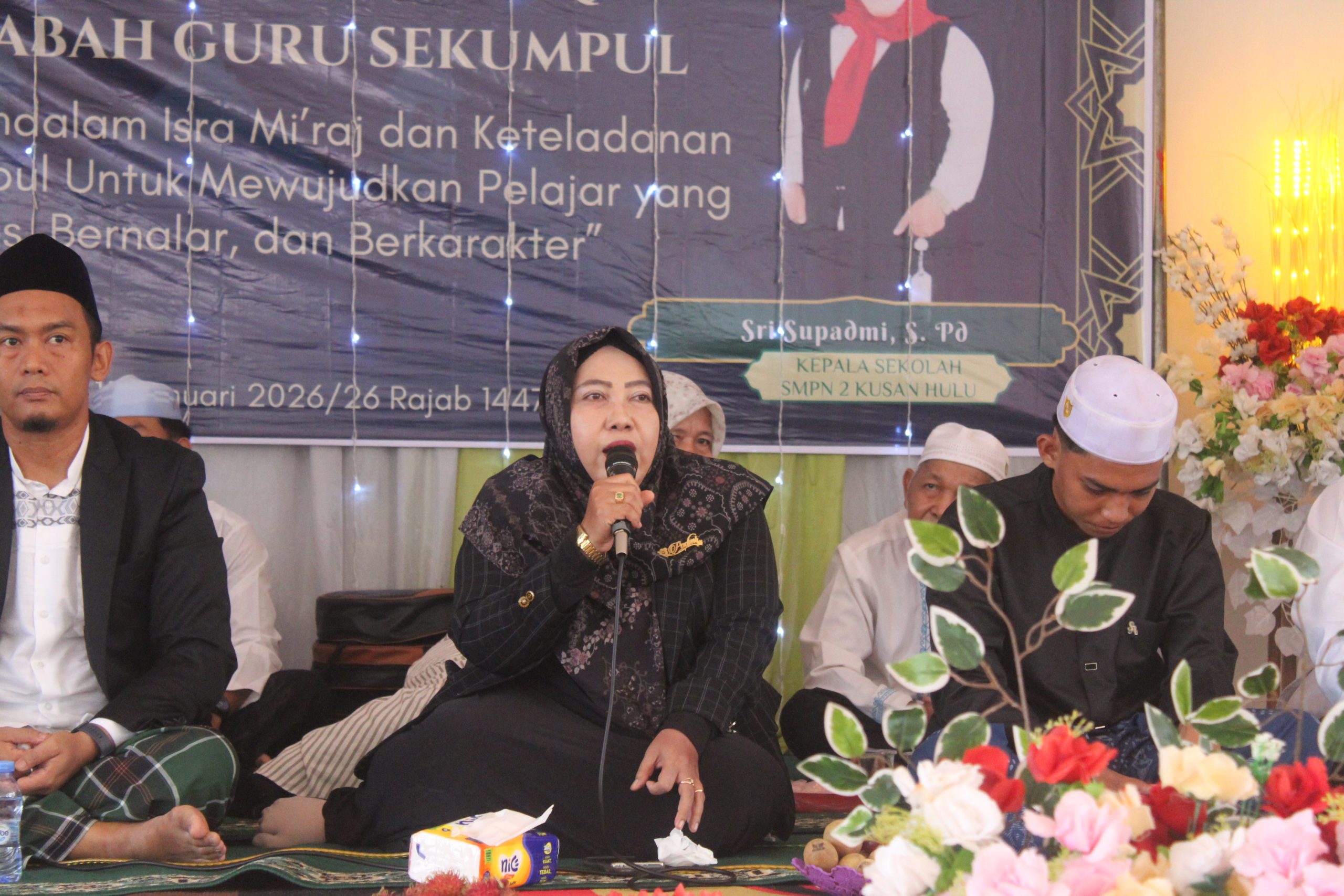 Kepala SMP Negeri 2 Kusan Hulu, Sri Supadmi, menyampaikan bahwa peringatan Isra Mi’raj dan Haul Guru Sekumpul menjadi bagian penting dalam pembinaan karakter peserta didik.