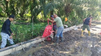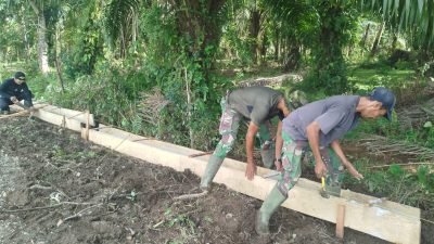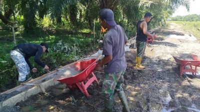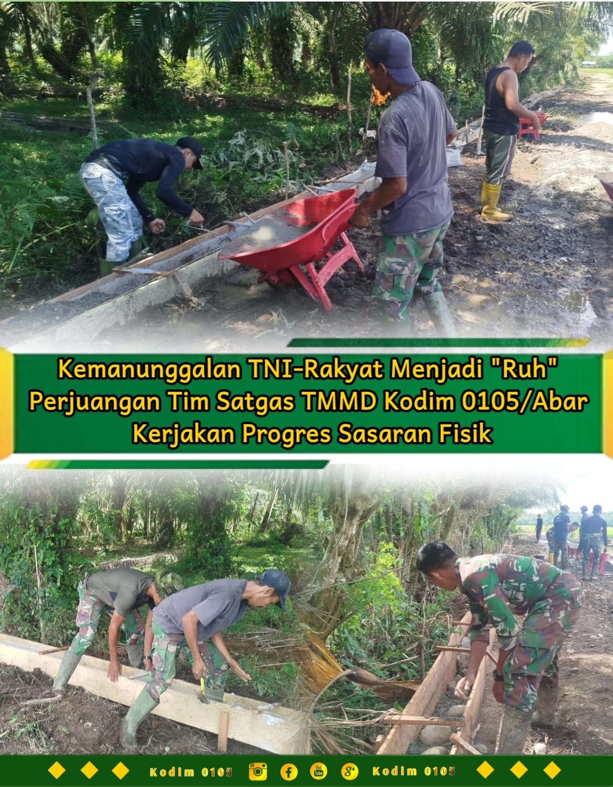 Di bawah teriknya sengatan mentari, Tim Satgas TMMD Reguler ke-127 Kodim 0105/Abar bersama masyarakat tampak begitu solid dan penuh semangat berjibaku, bermandikan keringat demi merampungkan progres sasaran fisik berupa pengecoran Talud Penahan Timbunan (TPT) di Desa Pasi Aceh, Kecamatan Woyla, Selasa (24/2/2026).