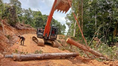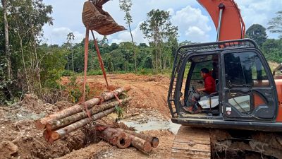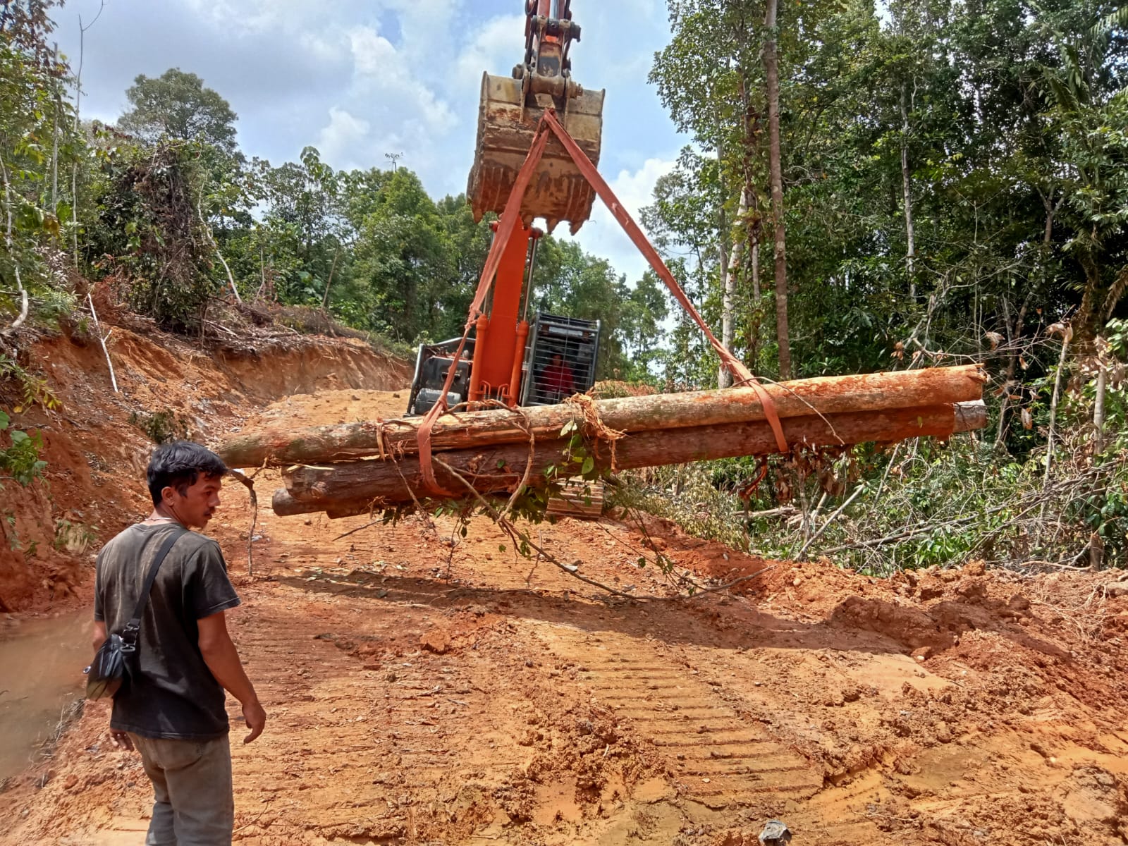 Di Lokasi terlihat alat berat mengangkat batang-batang kayu glondongan yang kemudian ditempatkan pada bagian dasar jalan. Kayu tersebut akan menjadi lapisan pertama sebelum ditutup dengan timbunan tanah.