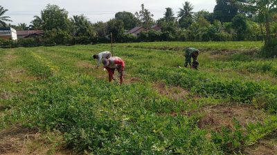 Di lahan perkebunan semangka, Personel Satgas dan masyarakat terlihat kompak melakukan perawatan tanaman dengan cara memangkas tunas-tunas yang tidak produktif. Metode ini dilakukan agar nutrisi tanaman terfokus pada pertumbuhan buah sehingga dapat menghasilkan semangka yang lebih besar dan berkualitas.