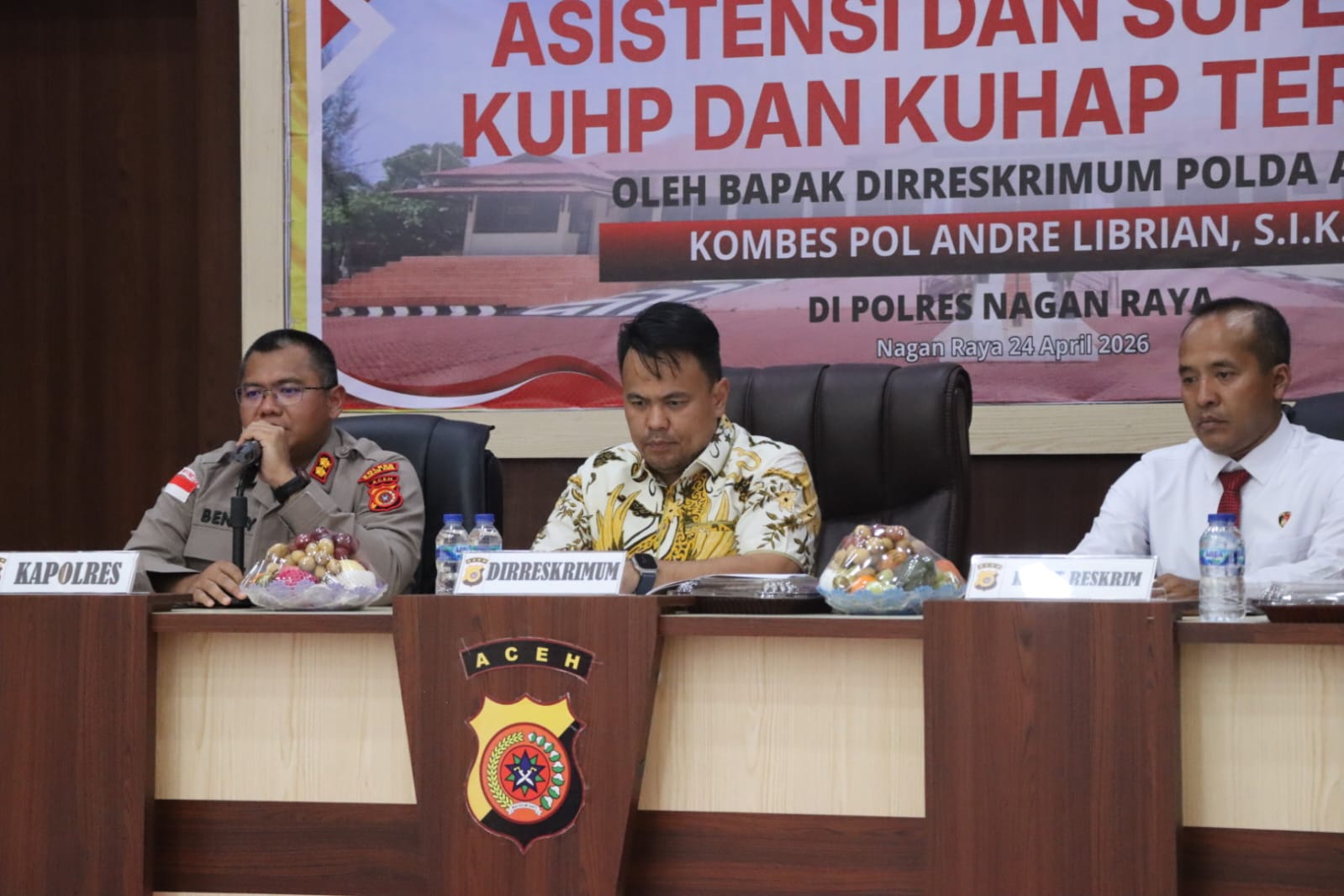 Dalam rangka meningkatkan profesionalisme dan kualitas penegakan hukum, Direktorat Reserse Kriminal Umum (Ditreskrimum) Polda Aceh melaksanakan kegiatan asistensi dan supervisi terkait penerapan KUHP dan KUHAP terbaru di Polres Nagan Raya,jum’at 24 April 2026.