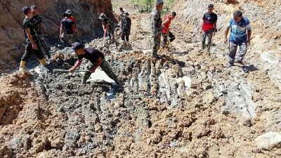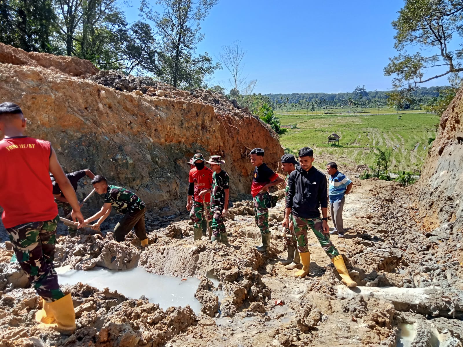 Jalan tanah itu tampak seperti halaman luas yang baru selesai diguyur hujan. Lumpur melekat di setiap pijakan, sementara air mencari tempat rendah untuk berkumpul. Melihat kondisi tersebut, anggota Satgas TMMD bergerak cepat agar jalur tetap dapat digunakan masyarakat.