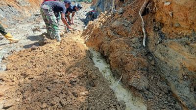 Kerja dilakukan tanpa banyak menunggu. Setiap ayunan alat menjadi langkah kecil yang menjaga jalan tetap berfungsi sebagai penghubung aktivitas warga desa. Kebersamaan antara prajurit dan masyarakat terlihat jelas, menghadirkan suasana kerja yang ringan meski medan cukup berat.