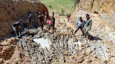 Dengan sekop dan cangkul di tangan, para personel membuat jalur air manual di sisi jalan. Aliran kecil dibuka perlahan, ibarat membuka pintu bagi air agar tidak lagi menetap di badan jalan. Di waktu yang sama, tebing yang terlihat kurang rapi juga diperbaiki untuk mencegah longsoran tanah.