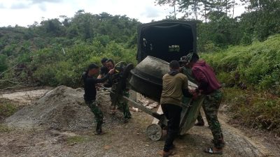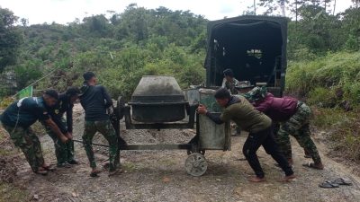 Salah satunya dengan pekerjaan box Culvert yang selama ini sulit dilalui oleh masyarakat setempat. Dimana untuk kegiatan awal ini, para anggot satgas mulai menurunkan peralatan berupa mesin molen beton untuk membantu dalam pengecoran.