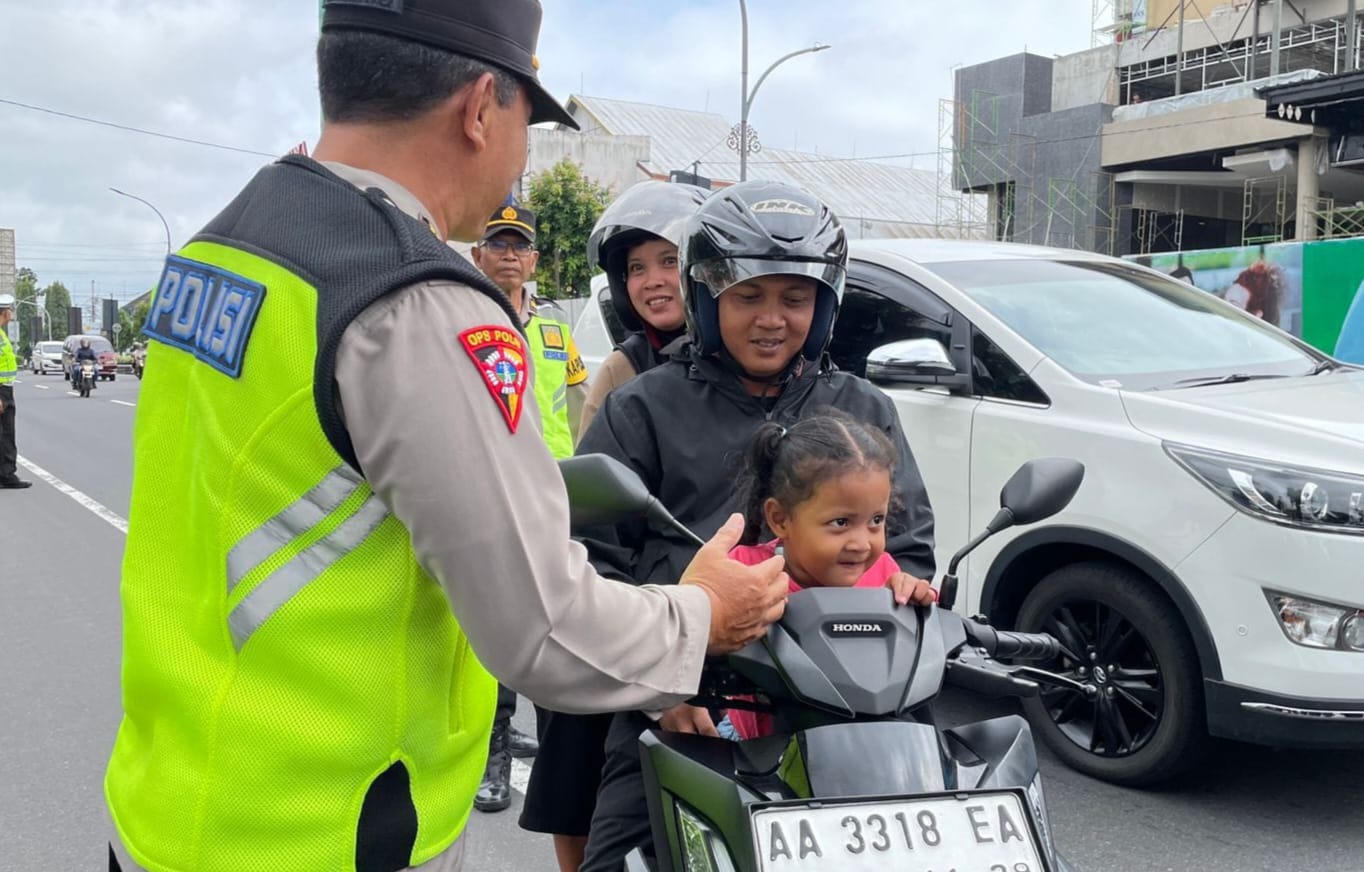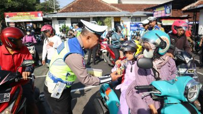 Selain memberikan sosialisasi, membagikan brosur tertib berlalulintas, petugas juga membagikan pembagian helm bagi pengedara roda dua yang tidak memakai helm standar. Serta membagikan bingkisan snack bagi para pengendara, terutama anak pembonceng berhelm.