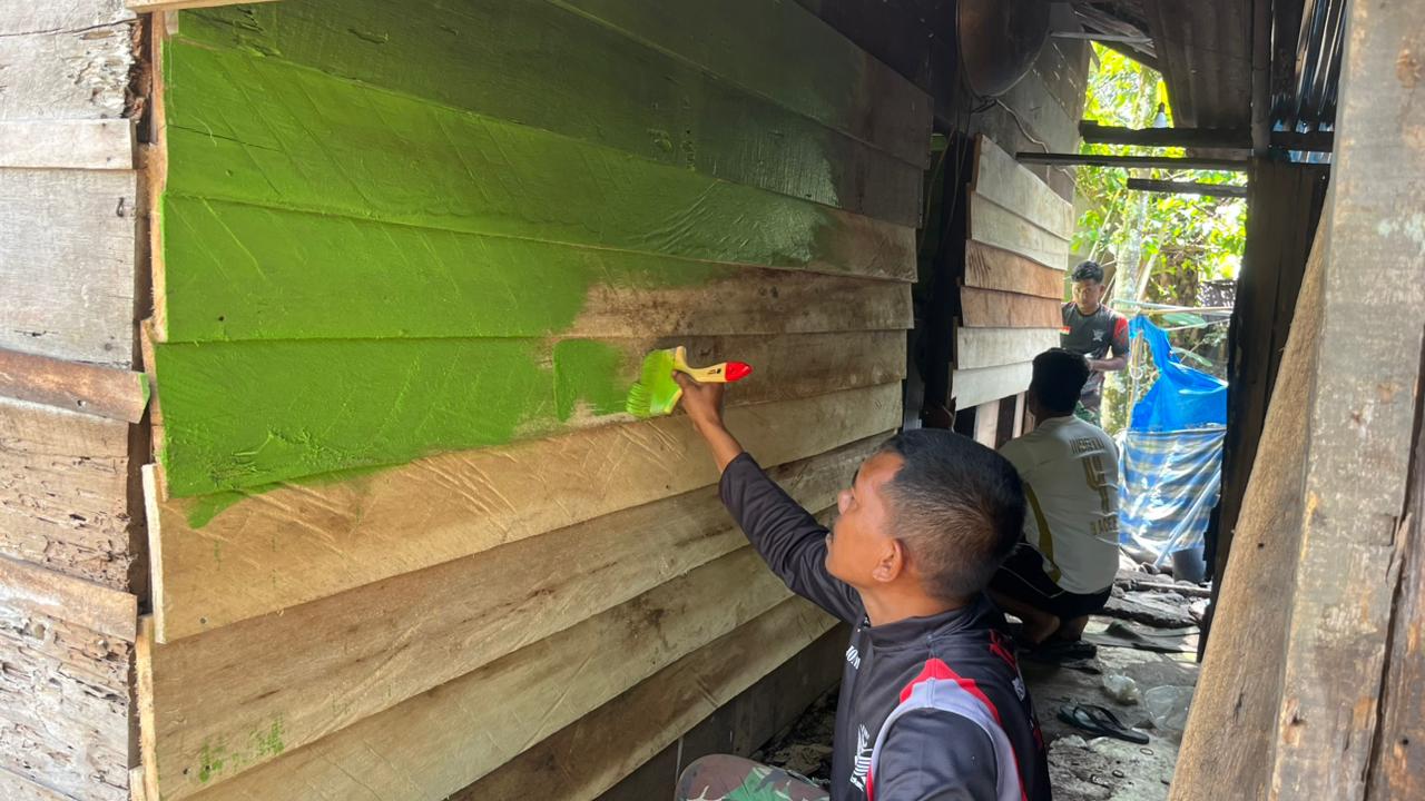 Terlihat di lokasi kegiatan RTLH berlangsung dengan pembagian tugas yang rapi. Sebagian personel memperbaiki struktur dinding, sementara lainnya melakukan pengecatan. Warna hijau yang menghiasi rumah menjadi tanda kehadiran TNI yang membawa semangat baru.